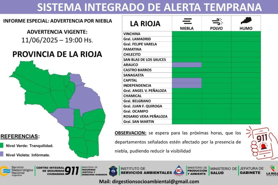 Por otro lado, el SIAT difundió un alerta por la posible presencia de niebla que afectará a los departamentos Capital, Independencia y Arauco.