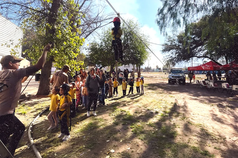 Los operadores del área instalaron y coordinaron actividades como la tirolesa, brindando a los niños la posibilidad de vivir la emoción de la altura en un entorno seguro, al tiempo que conocieron parte del trabajo que realiza la institución en montaña y rescate.