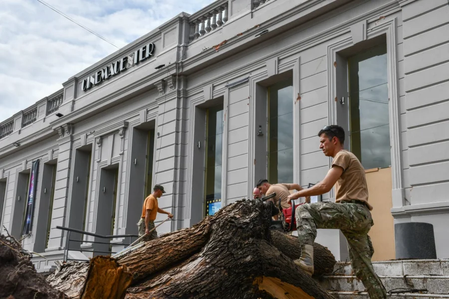 Durante la mañana del jueves, y nuevamente bajo una intensa lluvia sobre el centro de la ciudad, efectivos militares de la Compañía de Ingenieros de Construcción de Montaña 5 de La Rioja brindaron colaboración con hombres y maquinaria pesada para remover árboles y postes caídos sobre la vereda y el edificio del Paseo, lo que provocó daños materiales en el edificio histórico y cortes en el tránsito de la zona.