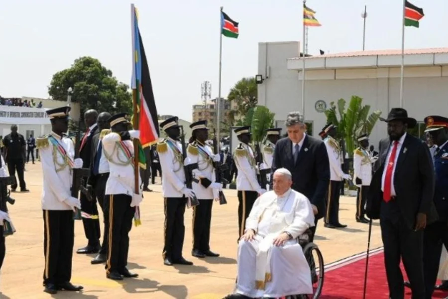 A su paso, la multitud coreaba ¡Bienvenido a Sudán del Sur!, ondeando banderas del Estado más joven del mundo y del Vaticano.