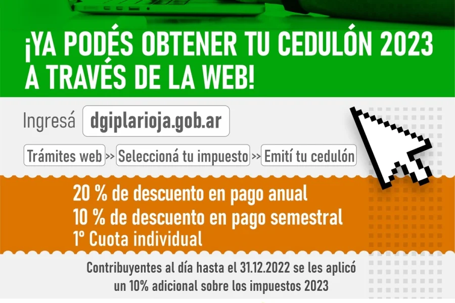 El Ministerio de Hacienda y Finanzas Públicas a través de la Dirección de Ingresos Provinciales comunica a los contribuyentes que en la página web www.dgiplarioja.gob.ar, ya se encuentran disponibles los cedulones de los impuestos del presente año y sus distintas formas de pago. En el caso del Impuesto al Automotor el vencimiento es hasta el 15 de marzo y el del Impuesto al Inmueble es hasta el 27 de marzo de 2023.