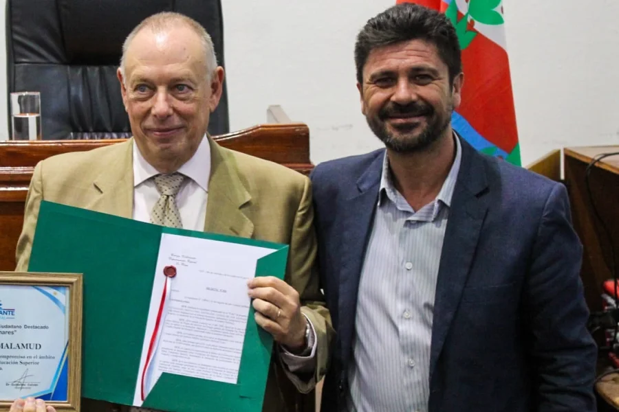 El viceintendente Guillermo Galván junto al autor del proyecto Nelson Johannesen entregaron el decreto N° 826 que declaró al Dr. León Héctor Malamud como Ciudadano Destacado “Distinción Ciudad de los Azahares”, por su extensa trayectoria, dedicación y compromiso en el ámbito de la salud y el desarrollo de la Educación Superior de nuestra Provincia. El acto se realizó minutos antes de la sesión de este miércoles y estuvieron presentes autoridades de la Facultad Barceló, médicos amigos del distinguido, familiares y público en general.
