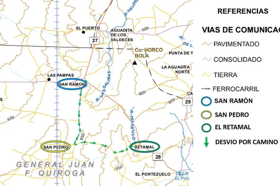 El Comité de Emergencias Provincial, a través de Vialidad de la Provincia, informó a quienes transiten por Ruta Provincial N° 27 desde Patquía (Departamento Independencia) hacia Portezuelo (Departamento Juan Facundo Quiroga) que al llegar a la intersección con Ruta Provincial N° 28, se deberá hacer un desvío de 30 kilómetros por un tramo de tierra en el paraje San Pedro.