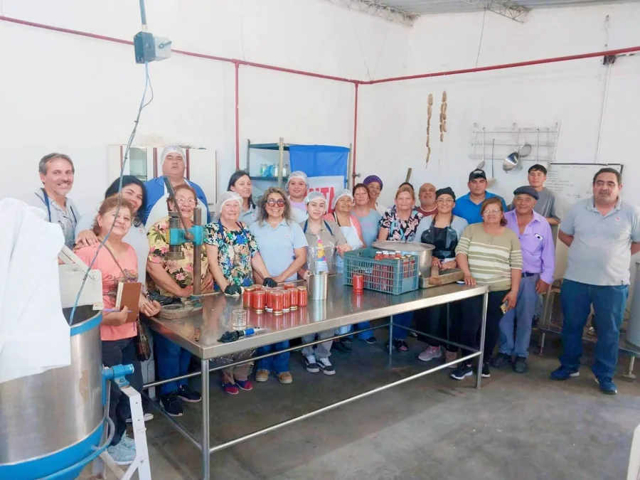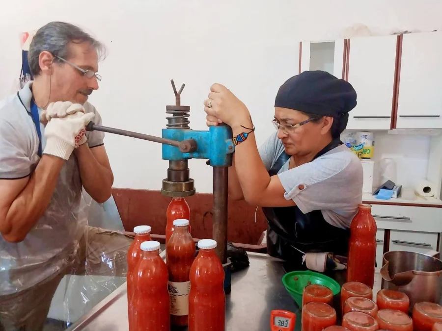Finalmente, en la sala de industria de la escuela agrotécnica, se desarrolló un taller de buenas prácticas de manufactura en la industria del tomate, coordinado por el técnico Maximiliano Giannini junto a María Chanampa y Malinche Astrada, integrantes de la organización Doña Vito. Allí los asistentes elaboraron tomate triturado como estrategia para agregar valor a la producción local.