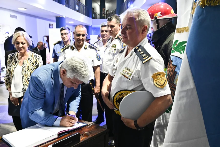 Al ingresar al predio, el gobernador Poggi saludó a los efectivos que aguardaban uniformados. El revisto de tropa fue sucedido por un saludo a la agrupación ’31 de Octubre’ para luego dar lugar a la entonación del Himno Nacional y un minuto de silencio en memoria a los agentes fallecidos que integraron el cuerpo policial.