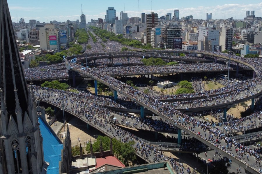 Engalanados con camisetas de la selección, algunas de ellas intervenidas manualmente con la tercera estrella, y con la ilusión de llegar lo más carca posible de los jugadores, saltaban y cantaban, mientras un hormiguero humano comenzaba a colmar las laterales de la avenida 9 de Julio.