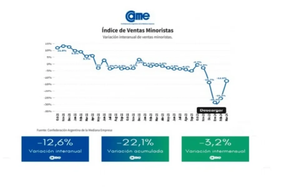 Así surge del Índice de Ventas Minoristas Pymes de la Confederación Argentina de la en Mediana Empresa (CAME), elaborado en base a un relevamiento mensual entre 1.350 comercios minoristas del país, realizado del 3 y 5 de abril.
