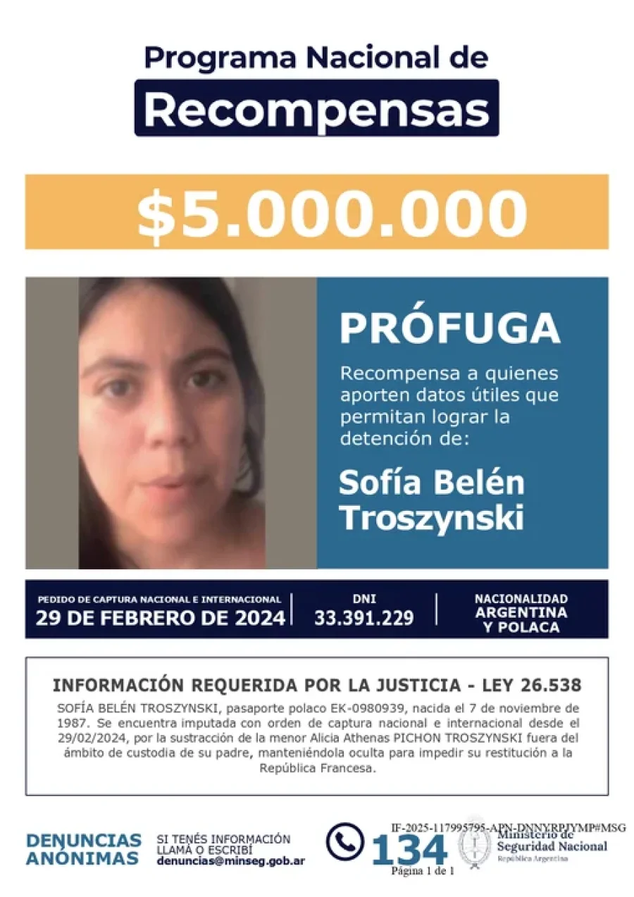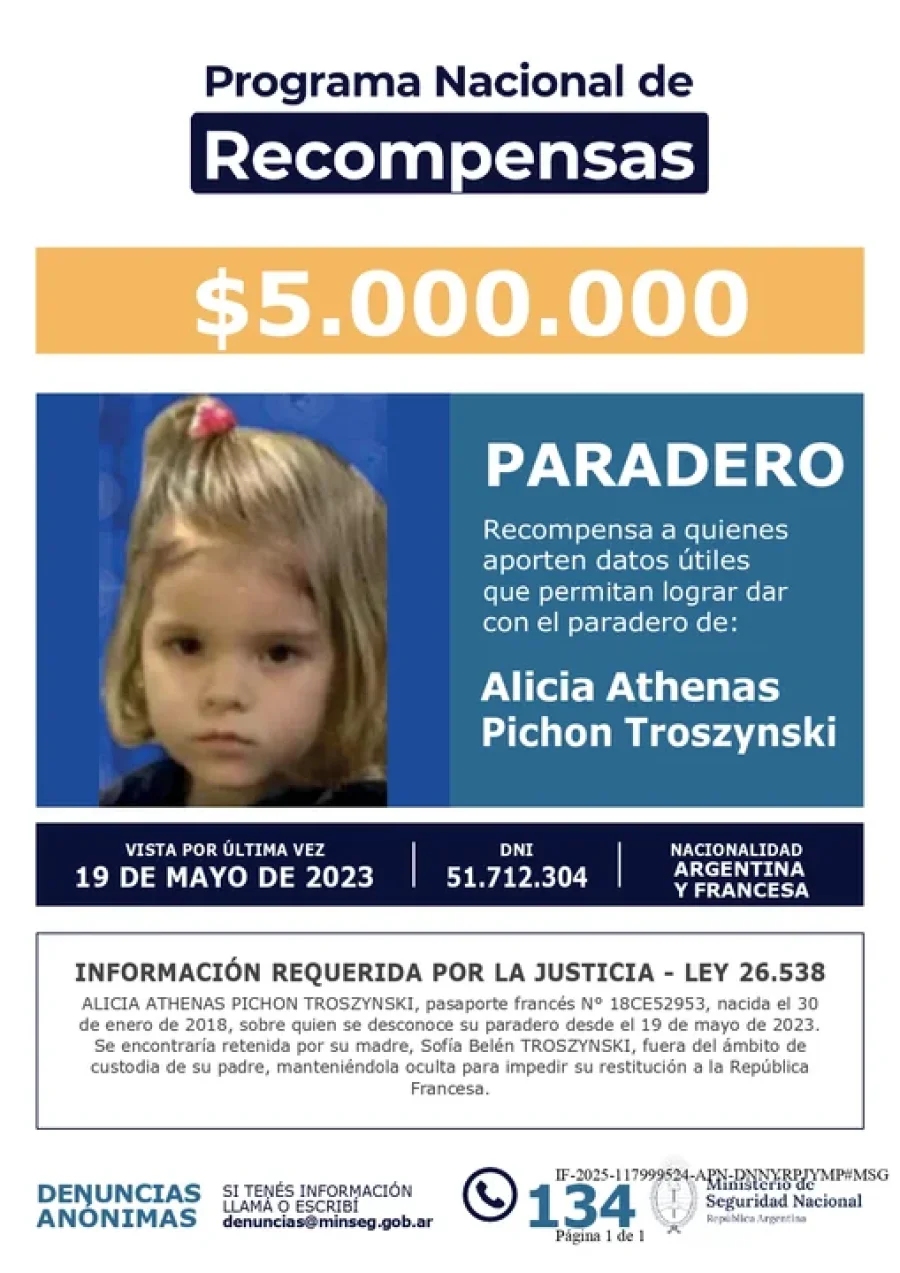 El Ministerio de Seguridad Nacional ofrece una millonaria recompensa para quienes aporten datos sobre el paradero de Alicia Athenas Pichon Troszynski, la niña que fue secuestrada por su mamá Sofía Belén Troszynski, quien posee una orden de captura nacional e internacional.