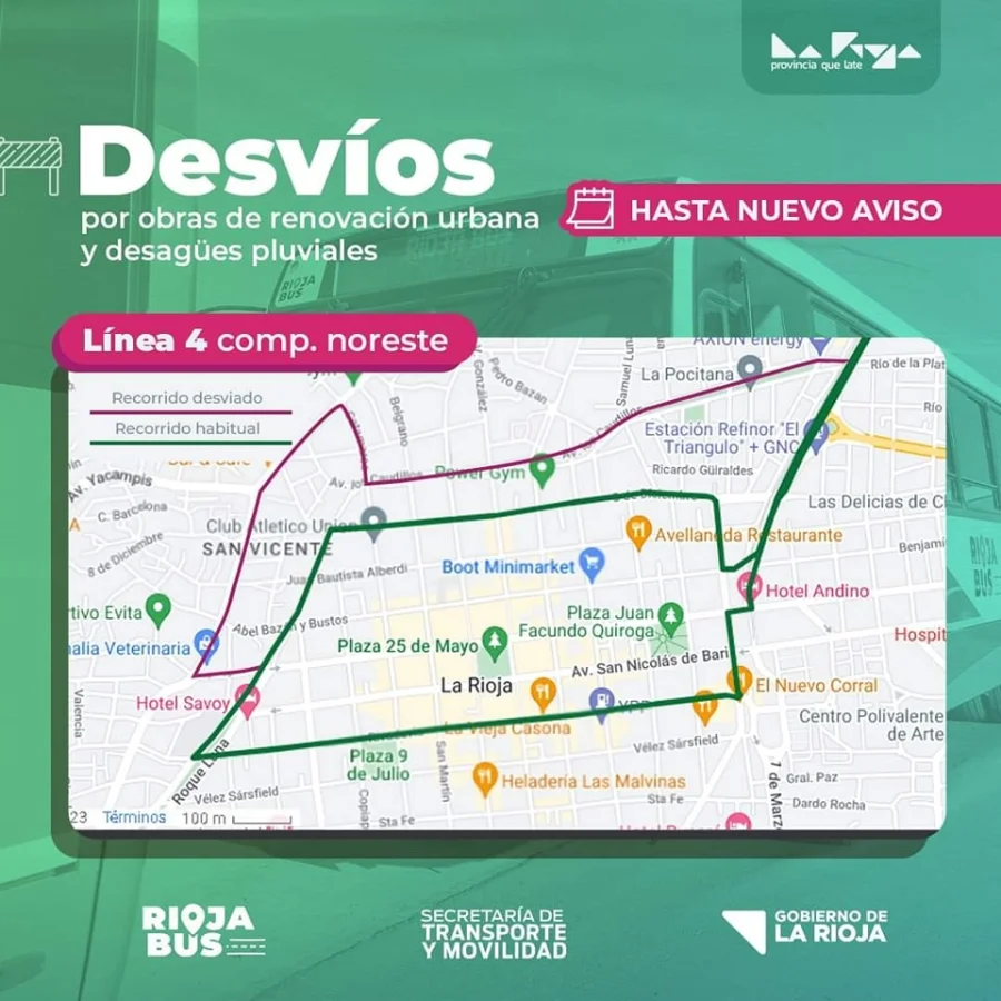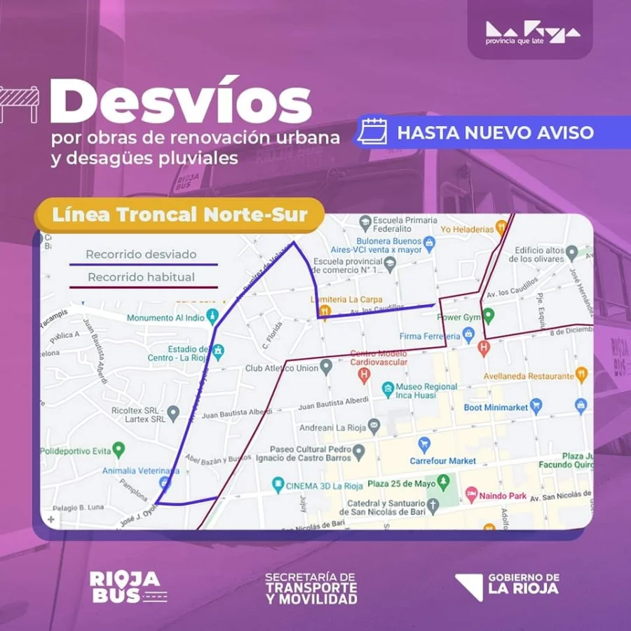 Agrandar imagen Enviar Imprimir Rioja Bus anunció desvíos en las líneas 4 y Troncal Norte-Sur desde este lunes Unirme al canal de Whatsapp de "Nueva Rioja" La empresa informó que los desvíos estarán vigentes a partir de mañana y seguirán hasta nuevo aviso.
