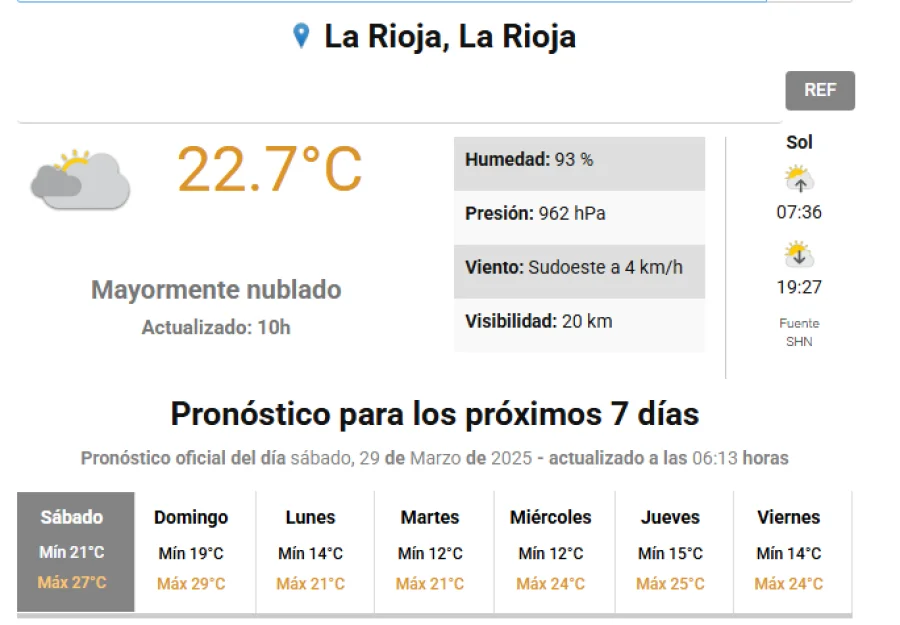Agrandar imagen Enviar Imprimir Sábado con cielo mayormente nublado Unirme al canal de Whatsapp de "Nueva Rioja"