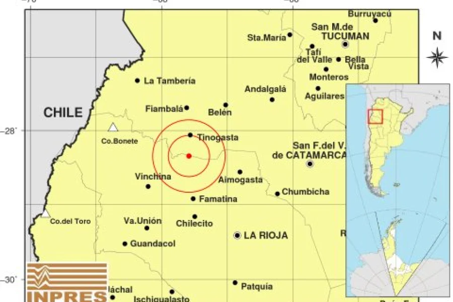 El organismo nacional con sede en San Juan puntualizó que el epicentro fue a 31 km al sur de la localidad catamarqueña de Tinogasta; a 76 km al noreste de Vinchina y 79 km al oeste de Aimogasta, cabecera departamental de Arauco, en el norte provincial.