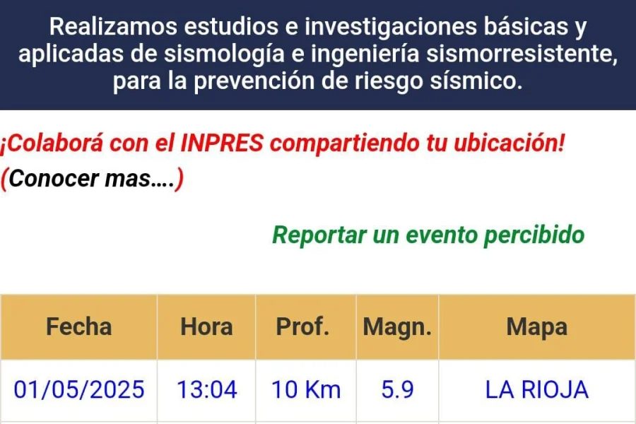 El sismo ocurrió con exactitud a las 13.04 en La Rioja, tuvo una magnitud de 5,9 grados y se produjo a una profundidad de 10 kilómetros, según el Instituto Nacional de Prevención Sísmica (Inpres). El epicentro fue a unos 37 kilómetros de Famatina. Según datos oficiales no hubo heridos ni víctimas mortales, aunque se evaluaban reportes de posibles daños materiales, que están sujetos a investigaciones, obre todo, quebradura en paredes de algunas viviendas y caída de mampostería.