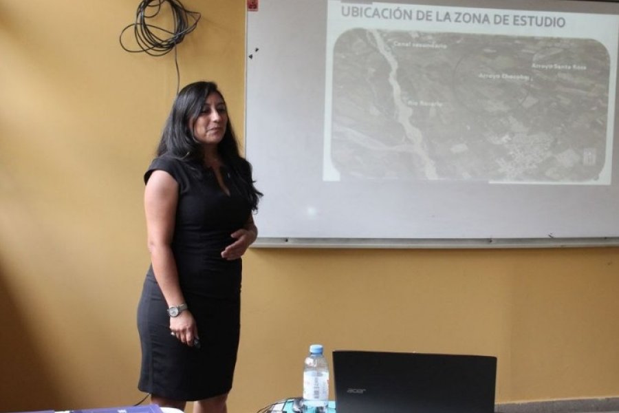 En primera instancia, la joven Ana Romina Godoy, expuso su trabajo sobre la obra Aluvional en Rosario de Lerma, Salta. El Proyecto comprende tanto la realización del estudio hidrológico como del estudio hidráulico, con el fin de determinar los volúmenes de agua y caudales de los sistemas de retención aguas pluviales y daños provocados por la mismas.