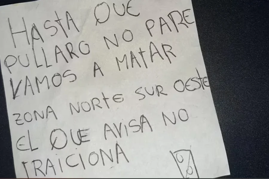 Escrito en un trozo de papel, el mensaje reza: “Hasta que Pullaro no pare vamos a matar. Zona norte sur oeste. El que avisa no traiciona”. La nota fue encontrada en la casa de una mujer ubicada en la calle Cayetano Silva al 1200, cerca del policlínico PAMI 2. La propietaria reportó el mensaje intimidatorio contra el mandatario provincial ante las autoridades policiales.