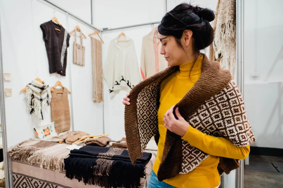 Las reversiones de los ponchos son boom en los Pabellones de Artesanías por la innovación en el diseño y la versatilidad para usarlos de diferentes formas y con distintas prendas. María Hortensia Delgado, de Belén, propone un moderno poncho “tipo capullo”, tejido en lana de llama con originales terminaciones en el cuello.