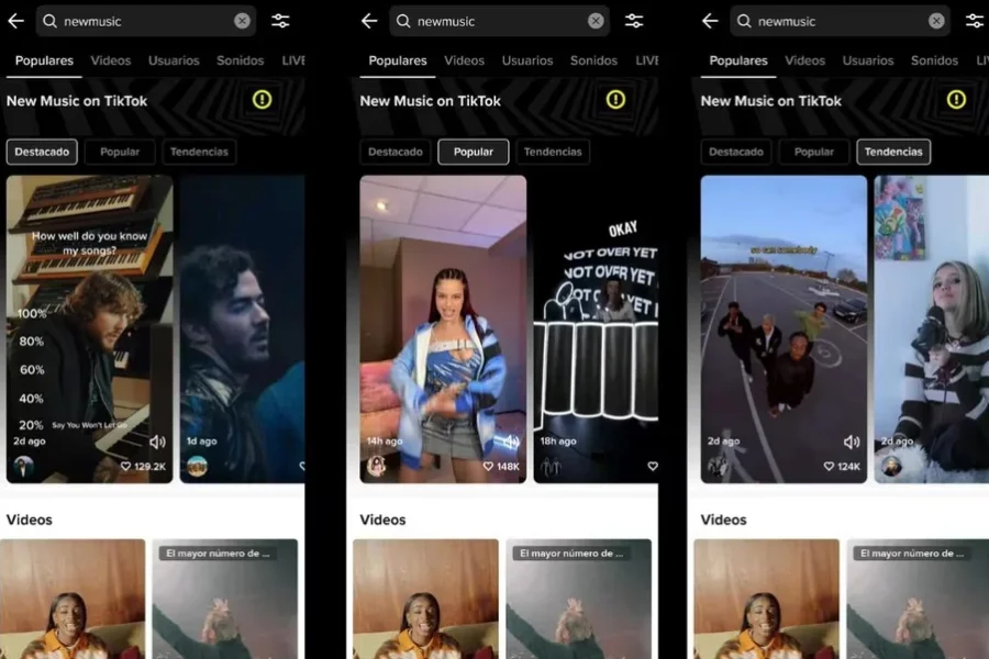 Así que ese el objetivo de esta nueva sección, que funciona yendo al buscador de la plataforma y escribiendo ‘NewMusic’ en él. Al hacerlo se abrirá una ventana negra con tres secciones: Popular, Destacado y Tendencias.